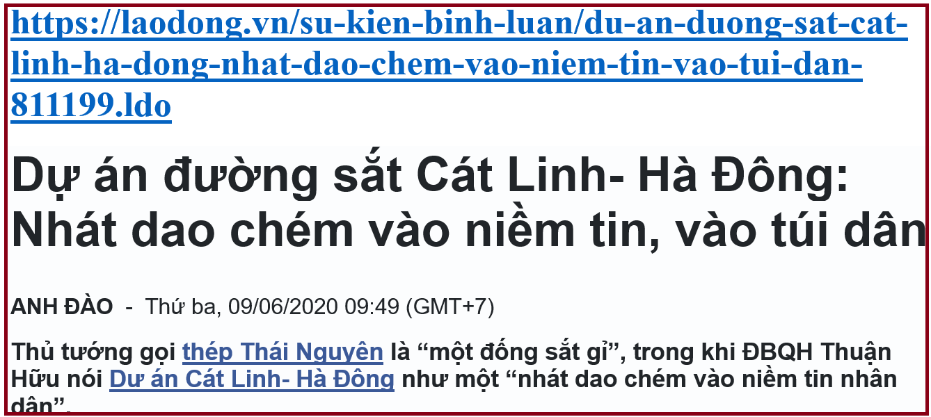 Báo VnExpress.net, Chủ nhật, 19/6/2022 viết “Dự án đường sắt Cát Linh - Hà Đông (tuyến 2A) dài 13 km, tổng đầu tư ban đầu năm 2008 là 8.770 tỷ đồng (tương đương 552,8 triệu USD). Dự kiến hoàn thành 2013. Đến năm 2017, tổng vốn đầu tư tăng lên 18.000 tỷ đồng, gấp 2,1 lần (khoảng 868 triệu USD). Báo cáo tài chính đã kiểm toán 2021 của Công ty TNHH MTV Đường sắt Hà Nội (Hanoi Metro) công bố doanh thu năm 2021 của doanh nghiệp chỉ 5 tỷ đồng, lỗ lũy kế 160 tỷ đồng. Câu hỏi đặt ra là lỗ nặng như vậy, Metro có phải là một sự đầu tư sai lầm?