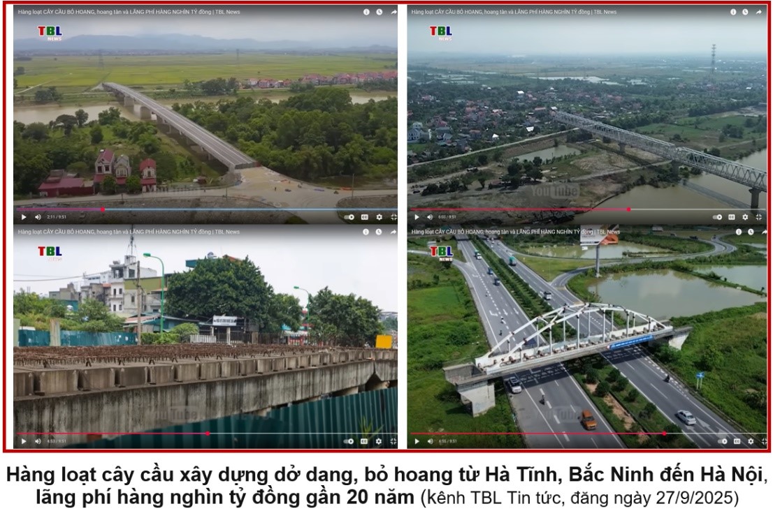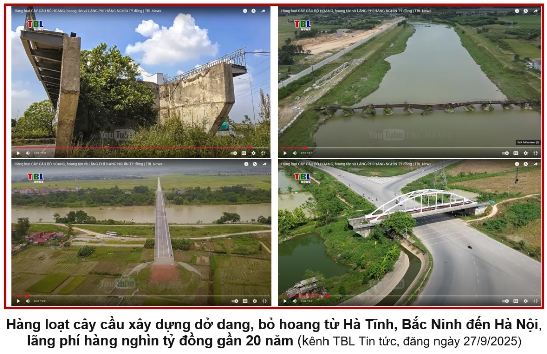 Kênh TBL đăng ngày 27/9/2025: Hàng loạt cây cầu xây dựng dở dang, bỏ hoang từ Hà Tĩnh, Bắc Ninh đến Hà Nội đang trở thành những công trình giao thông hoang tàn, lãng phí hàng nghìn tỷ đồng gần 20 năm. Những dự án này không chỉ gây lãng phí ngân sách nhà nước, mà còn tiềm ẩn nguy cơ tai nạn giao thông: